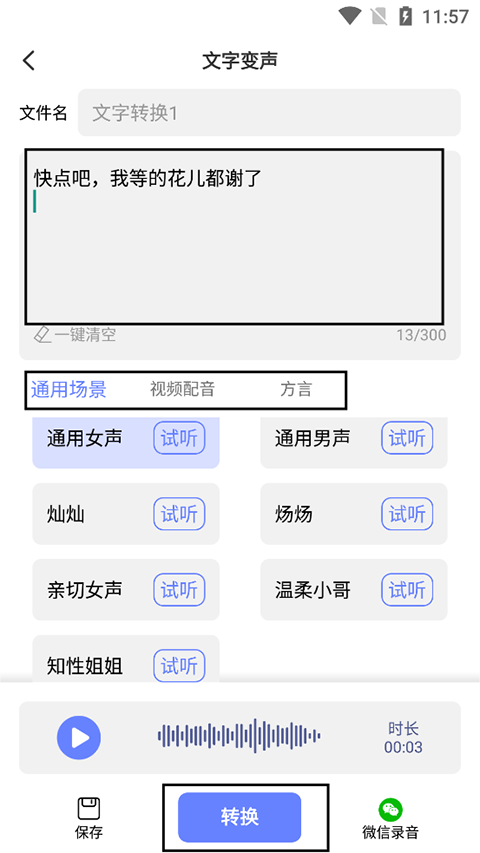 在文字编辑栏输入一段文字,选择音效,不仅有通用的一些音效,即使变声器还支持某些方言音效!选择完后点击转换就成功了,试听满意后便可保存,可以分享到微信。