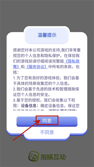 1、在本站下载并安装游戏后,打开游戏并选择同意即可进入游戏。
