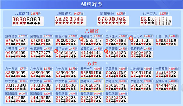 2、飘胡:手中全是叉牌,最后对对胡或单贴胡,加2番(4倍底注)。
