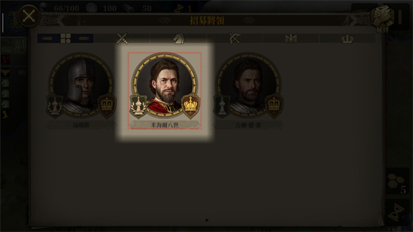 8、点击招募将领,将领属性分为步兵能力、骑兵能力、弓兵能力、内政能力和士气。内政主要影响城市产出加成以及任命为行政官时国家外交、内政加成等。将领通过升级军衔,可以获得能力点数来强化将领的各个属性(可重置),和解锁新的技能槽和士兵槽。传奇将领可通过升级爵位,来提高部队伤害和减伤效果。并且传奇将领都有与其对应的英雄传奇章节和专属装备,专属装备可以加成专属兵种和技能;
