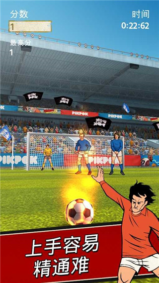游戏的操作和规则都很简单,我们可以用手指划出直线或者弧线控制足球的方向,虽然说是任意球,但其实和真实比赛中还是有所不同的,有些时候甚至是没有人墙或者是门将。但不管怎么样,我们的目标就是将球踢进球门中,然后途中不能碰到门将或者人墙中的队员。