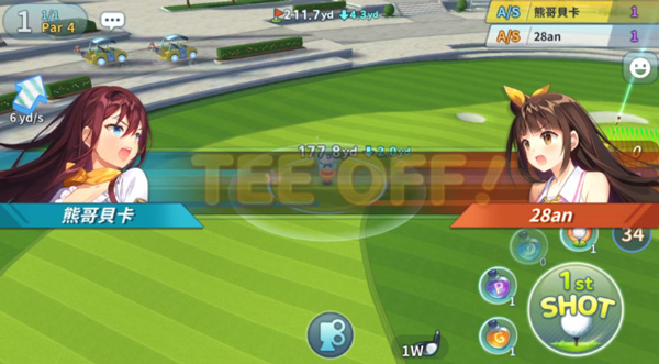 即时配对对战,但其中的细节就蛮讲求的,像是地形的区别,有分成高低处、一般地面、草皮或沙坑等等,每种都要用不同种类的杆来打,还有风向跟技能等等要素,只要取得球场上的道具箱,就可以在场上使用特殊道具,像是虫洞可以将球直接穿越地形飞往指定区域,算是蛮特殊的系统,而每位主角都有自己的专属技能,擅长的项目也各不相同,像是爱琳击球准确率较高但击球距离就不是很远,而玛蒂娜则相反,击球距离远但准确率不高,而角色等级会影响能力值与技能,所以建议新手先去完成新手教学,透过新手教学可以将角色提升到一定程度,而不足的部分可以透过装备来补正