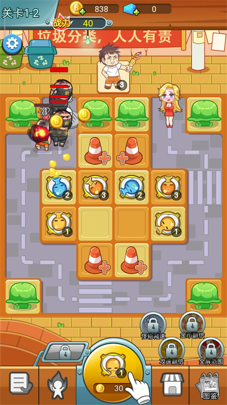 3、玩家需要保护那个女孩,利用空余位置放置道具来消灭人群,炮塔可以进行合成,合成之后会变更高级的炮塔;
