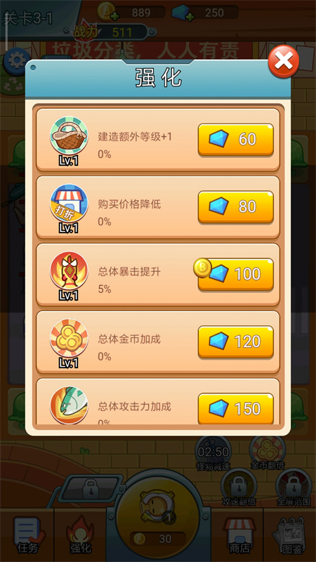 2、你需要不断的升级炮台等级加强炮台攻击力,才能更好的保护你的女神的安全。