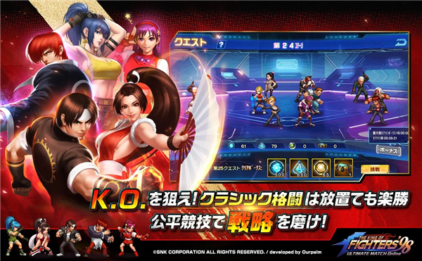 拳皇98终极之战OL日服(KOF'98 UM OL)是由FingerFun Limited打造的一款经典格斗系列手游,同时也是拳皇98终极之战系列中最新的作品。在该版本中你可以体验到原汁原味的格斗体验,日式的热血人物配音,搭配上各种我们熟悉的大蛇、八神庵 火炎拔罐草薙京等角色,支持多种语言。