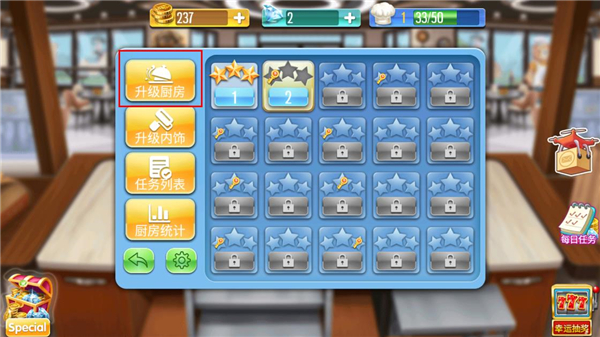 1、在选择关卡的界面旁,可以选择升级厨房、内饰、任务列表等。