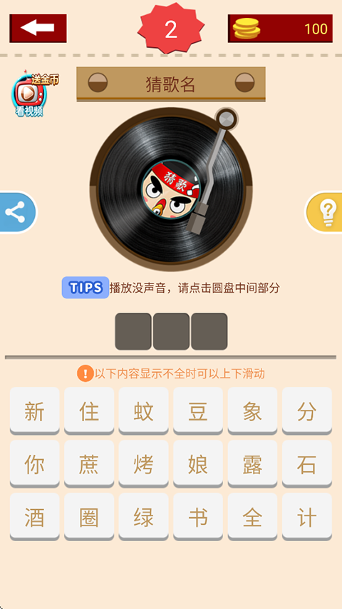 5、【歌词模式】:根据歌词猜出歌名,每过一关奖励100金币,游戏中每隔10分钟奖励100金币,回答错误一次扣除50金币。