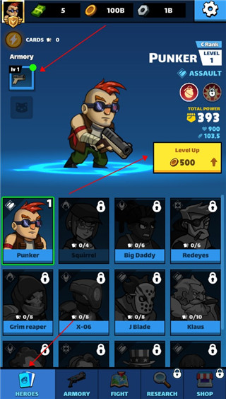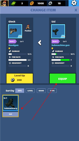4、击杀敌人后会掉落金币,我们可以点击角色来对其进行升级,还可以点击右方使用道具