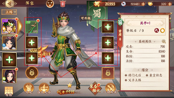 1、每一名武将都可穿戴6件装备,有着绿、蓝、紫、橙、红五种品质,品质越高,提供的基础属性就越高。