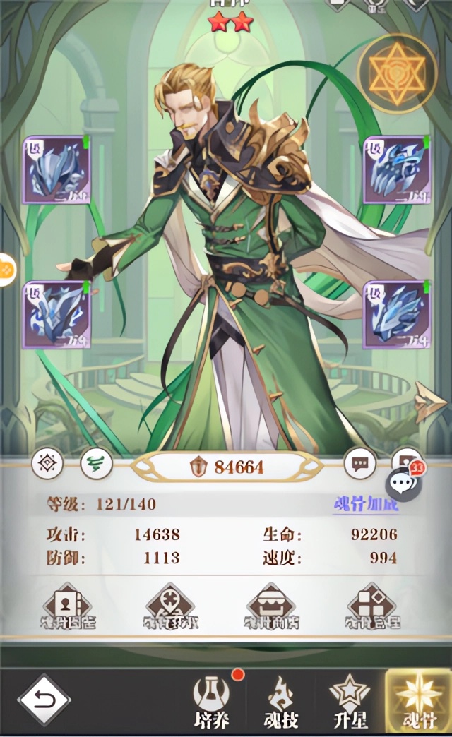 通过吸收魂师整卡材料进行升星,不同星等的升星需要不同的整卡。每次升星可提升魂师级别,并增加魂师攻击成长和生命成长的提升。