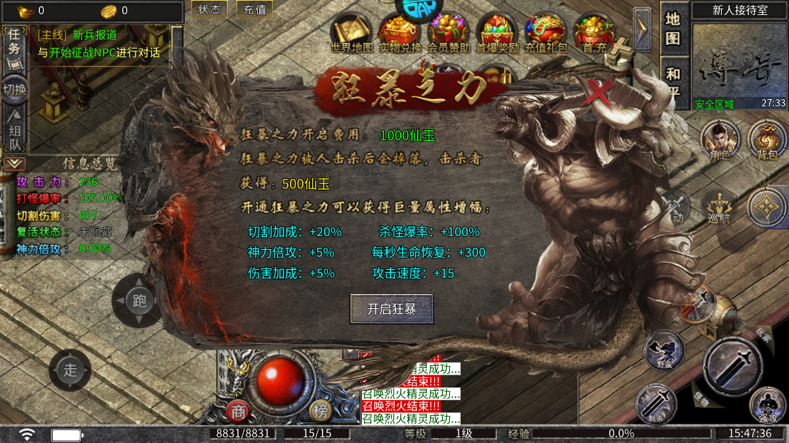 1、上线即送自动回收、范围拾取、自动吃经验、创角礼包