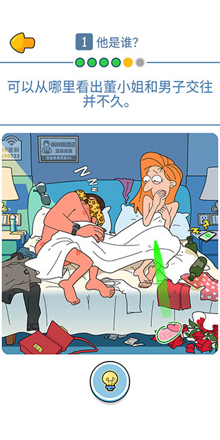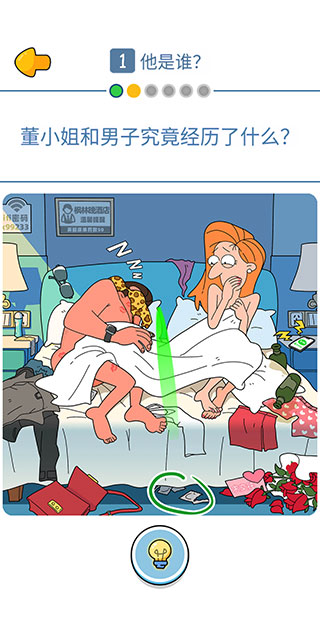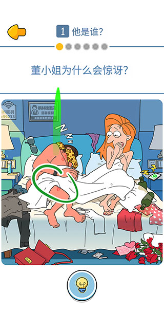 董小姐的十段恋爱这款手游拥有数十个独立关卡,我们以其中的第一关为例,来为大家讲讲这个游戏是怎么玩的。游戏中的每个关卡都会有若干个问题需要解答,全部解答完成就可以通关了,我们只要点击图中看似是问题原因的区域即可完成解答,那么第一关的六个问题如下: