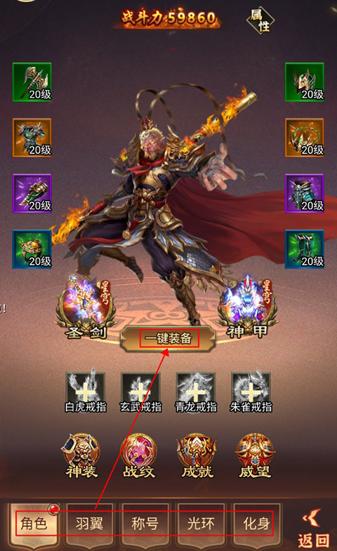3、通过击败敌人可以爆出各种装备,玩家可以在角色界面一键穿戴,还有羽翼、光环等系统可以解锁穿戴。