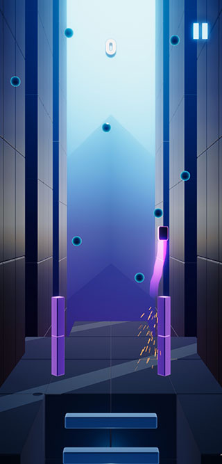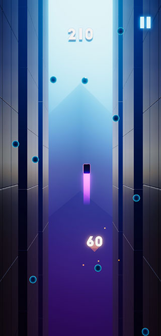 3、当小球触碰到两侧的紫色柱体就会起步向上冲刺。