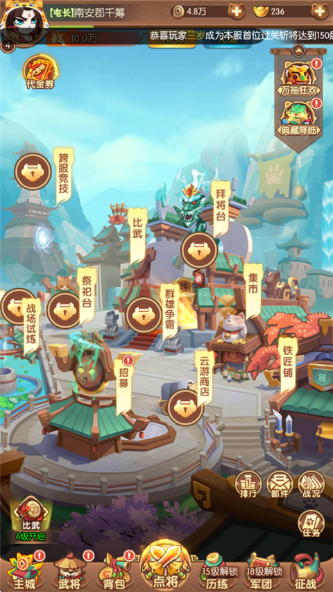 推荐组合:曹操(魏国光环)+关羽(蜀国输出)+孙策(吴国坦克)+贾诩(群雄减益)优势:平衡攻防,适应多场景,前期开荒首选。