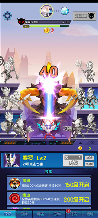 游戏中的每个奥特曼都会有各自的强力技能,比如赛罗,一开始是只有普通攻击的,但到达10级之后,就会解锁集中火力技能(每秒自动攻击10次)。到达25级解锁死神技能(召唤3个死神战斗),50级的熔岩爆裂(天降陨石),100级的狂暴(提高暴击),150级的激怒(增加300%的伤害),200级的嗜血(提高全体300%的攻速),250级的贪婪(提高金币获得),每一个技能都非常的强力。