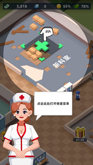 3、扩建完成后,点击场景中的加号即可解锁建造新科室。