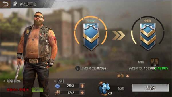「英雄升阶」:消耗一定量的英雄碎片和英雄徽章时,便可提升英雄的军阶。 英雄升阶后,将获得大幅的战力加成、基础数值加成以及带兵数值加成。 另外,玩家可以通过提升英雄的军阶来提升该英雄的技能等级之上限。 英雄的军阶上限会被「英雄中心」的当前等级所限制。