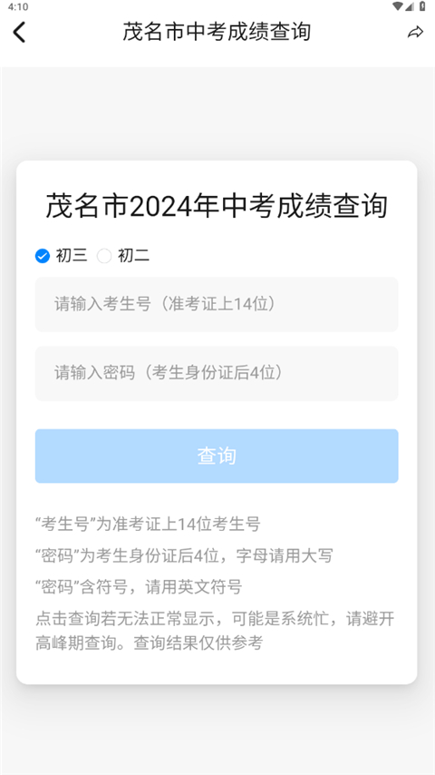 3、输入考生相关信息查询即可(支持初3/2学生成绩查询)。