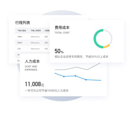 行程费用实时在线记录,异常订单主动提醒,违规用车一目了然,用车报告多维度数据呈现。