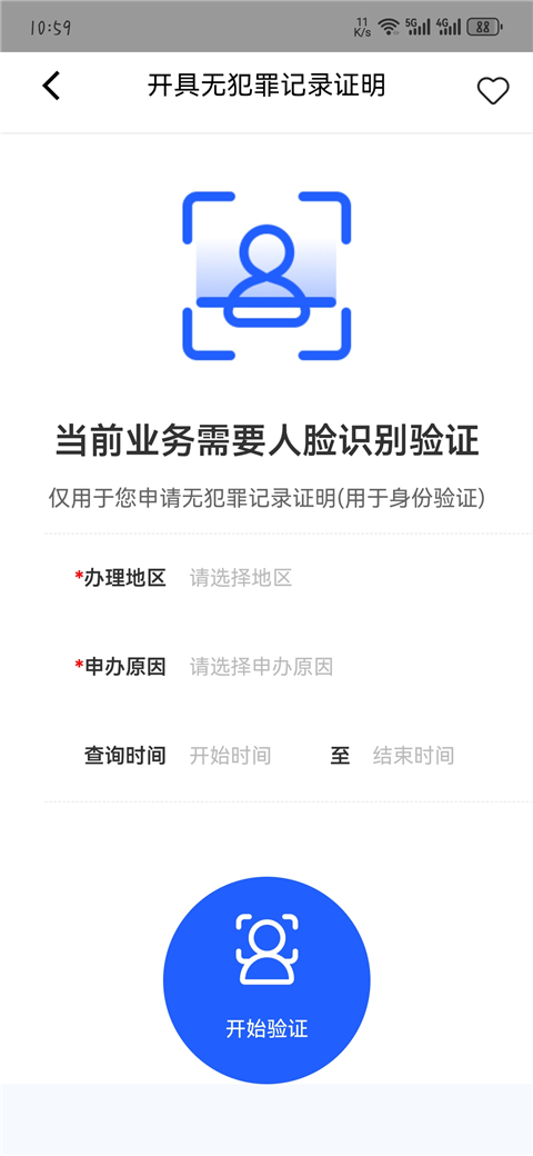 3、这一步需要进行人脸识别验证。首先要选择办理地区、申办原因和查询时间。其中的受理地类型可以是“户籍地”也可以是“居住地”,目前涵盖的地区包括北京、天津、江西、广西和四川,希望以后所有省市区都能“通办”!查询时间最好是从出生时间到现在。全部选好后点“开始验证”