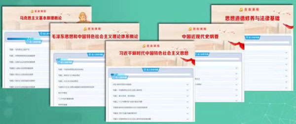 习近平新时代中国特色社会主义思想、毛泽东思想和中国特色社会主义理论体系概论、马克思主义基本原理概论、中国近代史纲要、思想道德修养与法律基础等。这五门课程是视频课程,在学习过程中,同学们要认真观看视频课件,不可快进,观看完视频课件方可答题,依次完成每个视频的 “专题测试” 环节和最终的“终结性考试”,本门课程学习才算合格。