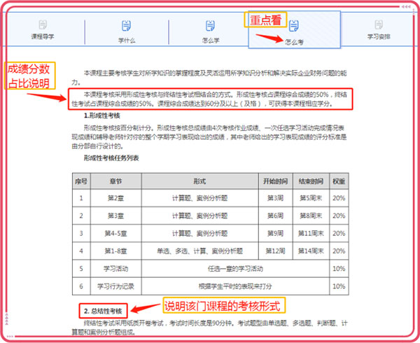 打开每门课程都会有课程导学,由于国家开放大学“作业形式和考试形式”多种多样,同学们首先预览该门课程“学什么”、“怎么学”和“怎么考”模块,大致清楚该门课程的作业形式和考核方式,了解分数占比,做到心中有数,确保作业和考试万无一失,稳稳的顺利通过。