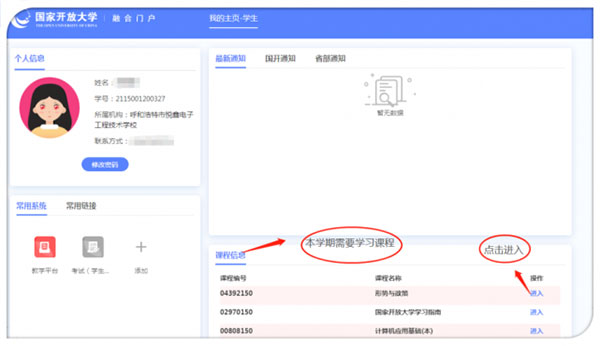 主要可以分为四个部分,它们分别是专业层次显示区、开放大学的重点通知、显示本学期所学课程、点击进入方可学习。