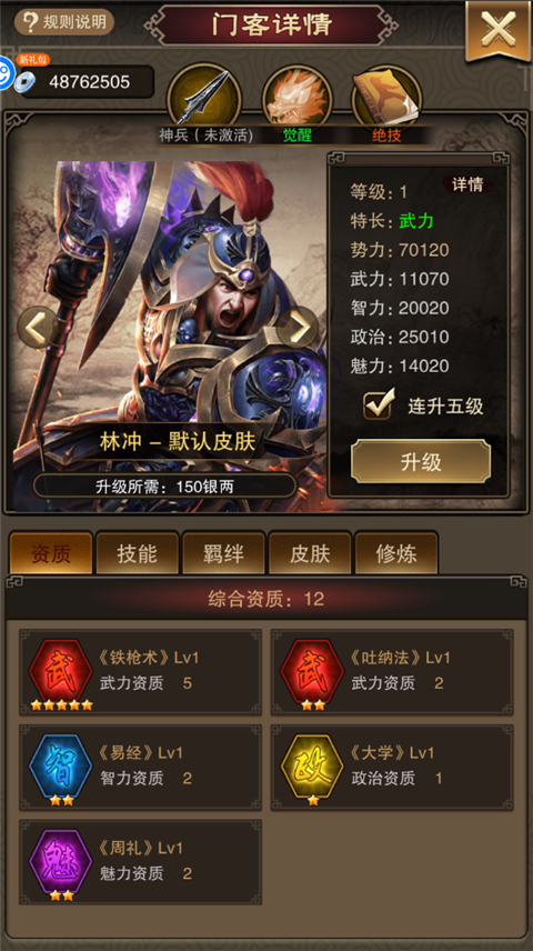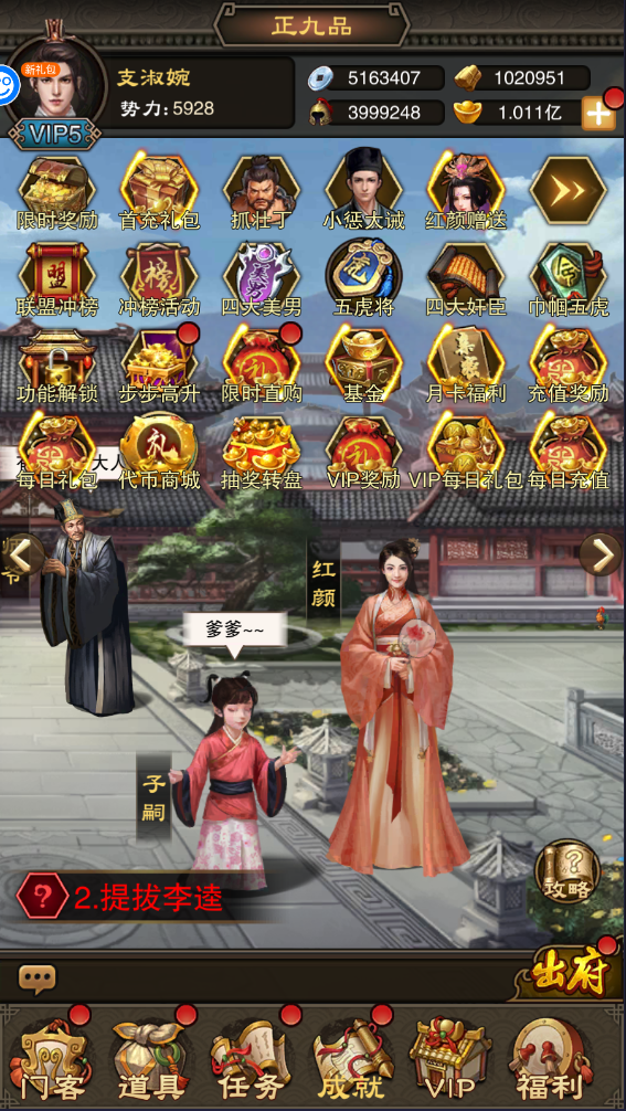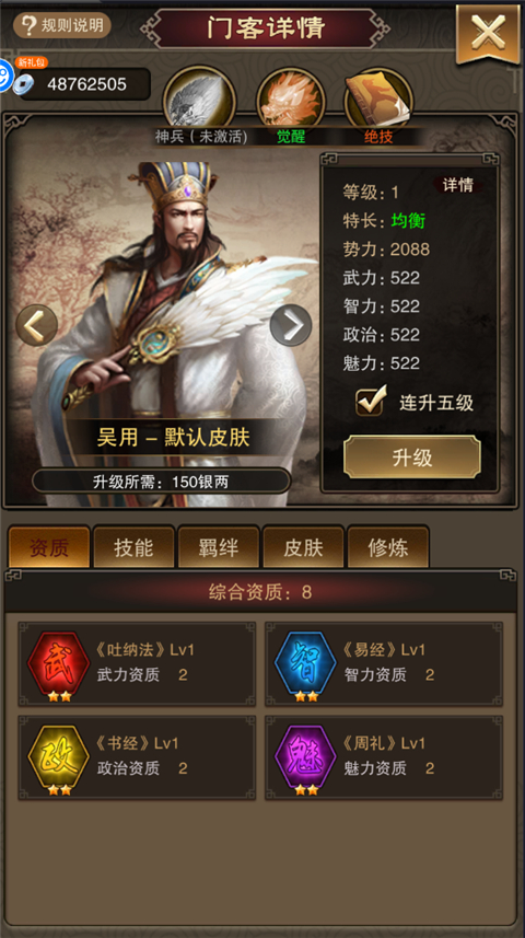 3、优先提升武力和智力门客,保证战斗力和银两产出,政治和魅力可稍后