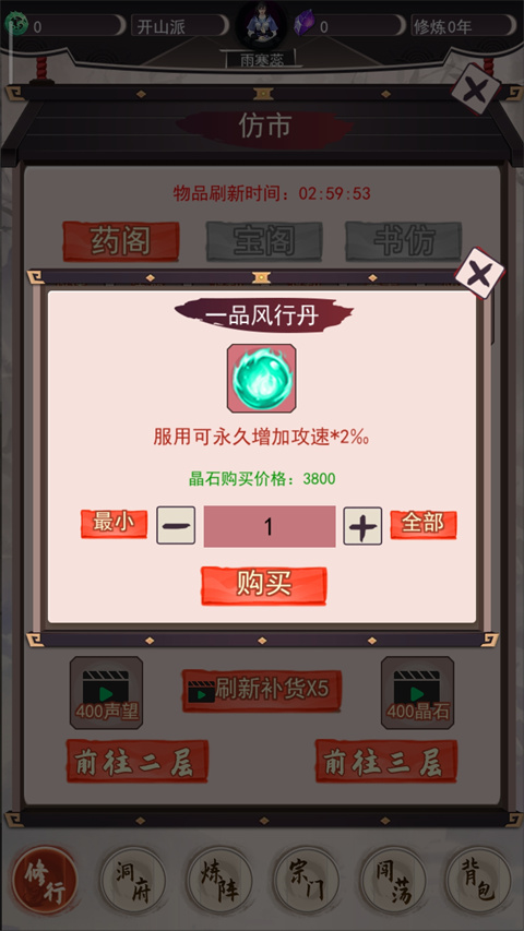 9、比如一品风行丹,服用可永久增加攻速*2%o,但是需要晶石购买,所以玩家需要好好修炼获得物资;
