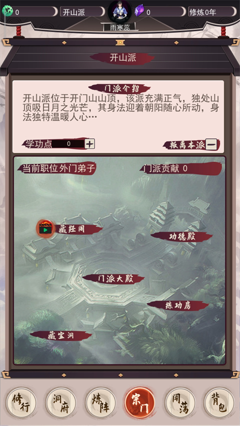 6、进入宗门,这里你可以选择不同的门派进行求学,不同的门派学习的都不同;