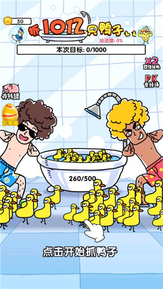 抓鸭子,抓几只?10亿只,抓着了,嘎嘎嘎嘎嘎嘎,还记得这个魔性的抓鸭子之歌吗?现在游戏来了,今日分享的是抓10亿只鸭子,由抖音梗衍生休闲益智类闯关游戏,不仅采用了最呆萌Q版的动漫游戏画面设计,使得无论是人物、小鸭子形象还是场景都十分诙谐又生动搞怪,以及拥有着魔性灵动的背景旋律,可给于大家一场全新抓鸭游戏体验。与此同时,抓10亿只鸭子最新版整体操作也是十分的简单,只需指尖不断的点击屏幕即可在线抓鸭并放置浴盆当中哦,而选择多种不同的鸭子对象,等级越高的对于你的加成也就越高,所以玩家也还可以利用各种各样的道具,亦或是通过金币升级游戏的属性来提升抓鸭子的效率,因为只要获得的积分就越多,通关之后大家可以获得更多的奖励哦。除此之外,抓10亿只鸭子最新版独特的彩蛋墙中还更提供有如蔡小鸭、小黄鸭、可小鸭、大鹅鸭、头盔鸭等鸭鸭可供大家解锁,并支持你邀请好友一起来进行作战,体验什么才叫做抓鸭子名场面哟,所以对此感兴趣的小伙伴欢迎前来本站下载游玩哈!