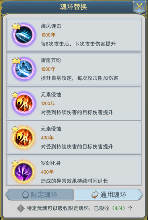 4、所以,不管是限定魂环还是通用魂环,我们应该就尽量获得带有星级的魂环,除了可以通过材料对魂环进行升级增加年份修为以外,还能够通过吸收同类魂环来进行升阶,进一步强化魂环对角色能力的提升。