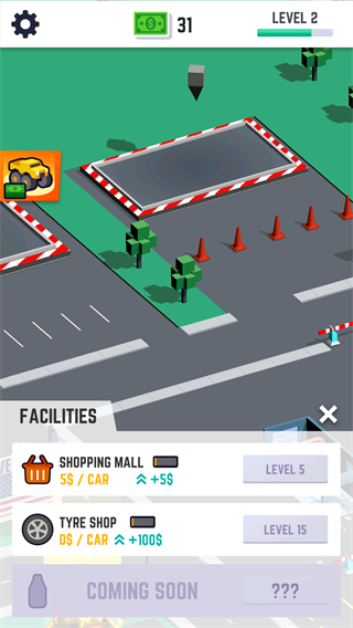 2、随着游戏的进行,当到达一定目标时,可以点击右上角的LEVEL,升级当前等级,每次升级都会解锁不同的车辆,每种车辆来光顾你的店,你都能获得不菲的收入。