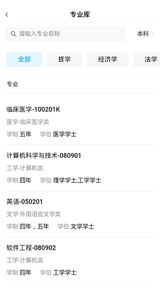 4、【专业库】:这里显示的是各个专业的简单介绍,上面依旧可以对专业进行筛选,如哲学、经济学、法学等。