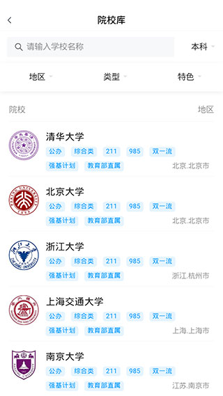 3、【院校库】:这里展示的是全国各地的大学院校,我们还可以在上方进行地区、类型、特色等条件的筛选。