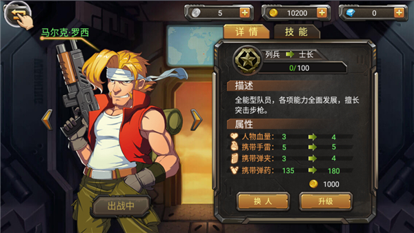 升级可以提升主角的血量和手雷、弹夹、弹道的携带量。
