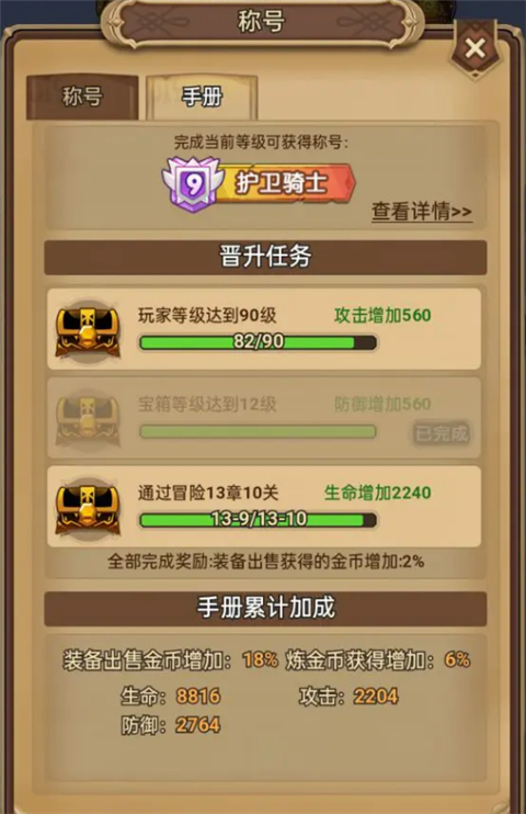 称号是一个随着我们不断成长培养解锁相应属性提升的功能,我们可以再称号手册里直观地查看当前称号升级到下一阶段所需要完成的任务,也可以查看称号为我们带来的战力加成和特别属性(如装备出售金币增加等)。