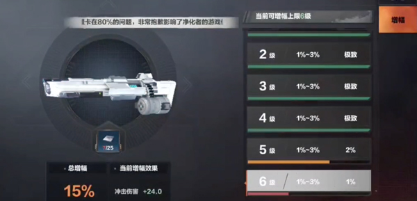 1~4级用一种增幅纸,五级以上用另一种。 所有的装备均可强化,百分之百成功,但是有阶段之分(1%~3%加成),不满意某阶段的强化可以再次强化武器。 比如在强化主武器过程中,只增幅到30%,那剩下的70%需要再次增幅,直到百分之百。 武器有耐久度,但可无限维修。