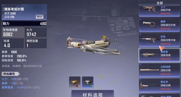 玩家可装备2把主武器、1把副武器、1把近战武器、6个防具武器(背心、腰带、护膝、枪套、手套、挂件),武器种类有:冲锋枪、步枪、机枪、弩弓、脉冲步枪、霰弹枪、榴弹炮、手枪、冲锋手枪、重型手枪。 这里主要介绍一下常用的一些武器和属性: