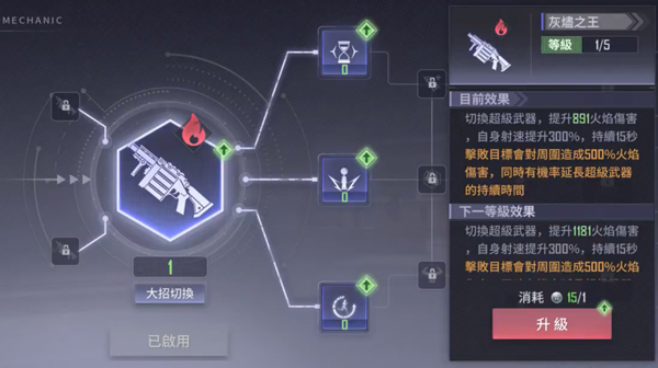 火属性。 自身攻速提升300%,击败目标会对周围造成500%火焰伤害,有一定概率提升超级武器的时间。