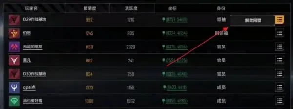 3、找到自己的ID后点右侧退出按钮即可选择退出(此处因为是自己创建的同盟所以只有解散)。