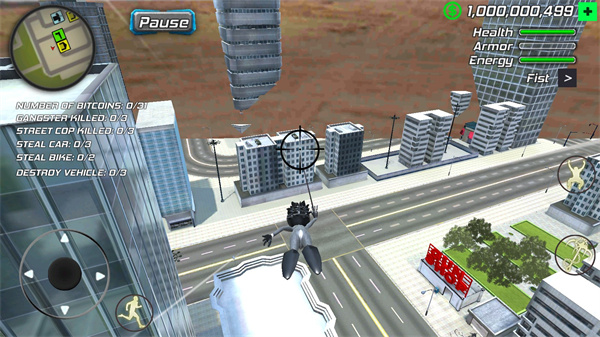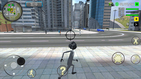 1、基础操作左侧移动、加速,右侧绳索,攻击(跳跃),跳跃,右上侧的武器更换以及血量、经验的显示都实时更新,一览无遗,凭借着大家自由的玩法,与其他帮派的人物进行交火,期间杀人能够获得经验,杀多了会产生星级,警察和其他附近角色会特殊照顾你对你展开火热的进攻,而如何存活,如何将其他人物击杀则是你所需要完成的任务。