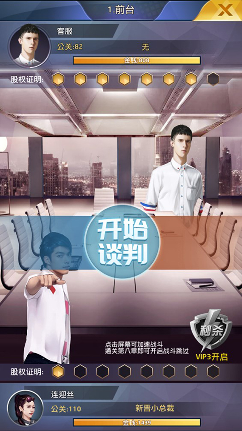 5、将员工培养完成后,就可以进入关卡开始商战谈判啦,将敌人击败即可获得胜利。