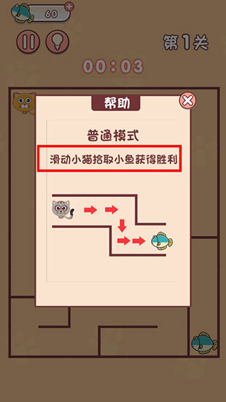 1、普通模式:滑动小猫拾取小鱼获得胜利;2、限时模式:限定时间内(25秒)拾取小鱼获得胜利;