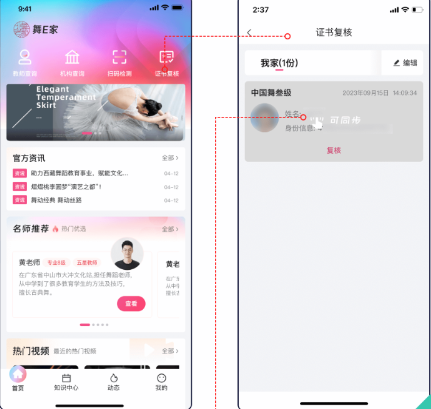 舞e家App是北京舞蹈学院官方推出的一款服务于舞蹈学院考级学生的服务平台,它集学生对考级证书查询、电子证书管理、师生社交为一体,为北舞考级人和社会提供多元化的服务。舞e家App还支持北京舞蹈学院学生进行实名认证,认证通过后即可在首页证书复核栏目查询并核验自己的舞蹈考级证书,还可以进行管理个人信息。此外,舞e家App还提供官方文章、公告,查询承办机构及教师信息,以及核验北舞考级数字电子证书等权益。