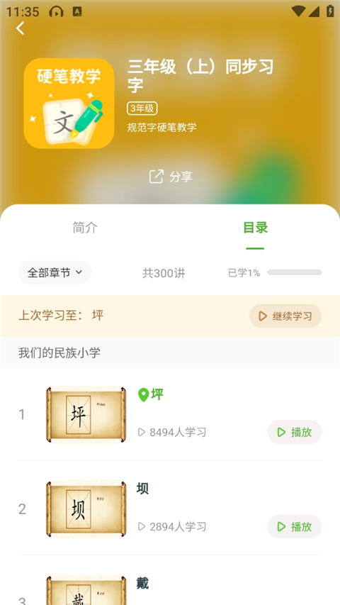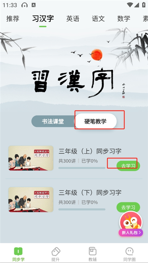 2、点击硬笔教学,和去学习
