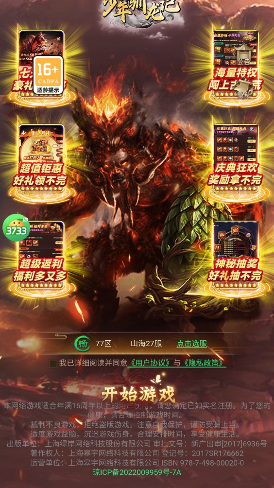 少年驯龙记是一款以上古山海经为背景的卡牌放置类手机游戏。游戏内置0.05折特权,充值享0.05折优惠,充值比例高达1元等于10w元宝,曾经让人犹豫的648,现在仅需3.24元。同时,游戏还有万元红包、跨服福星祈福等多样活动玩法。玩家进入游戏后将踏上上古八荒,异兽四大种族相互争斗之路,为了结束这场纷争,玩家需要不断收集强力异兽,将其培养进化,提升战力,激活羁绊,从而击败上古恶魔BOSS,保护山海世界的和平。