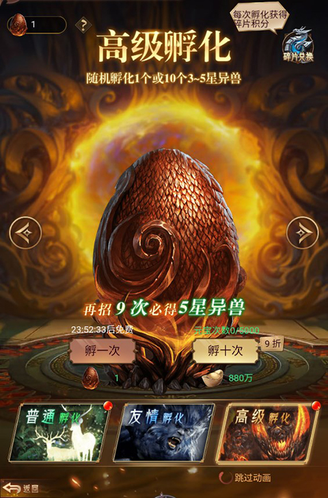 5、玩家可以通过异兽孵化抽取异兽,有普通、高级、友情三种孵化方式。