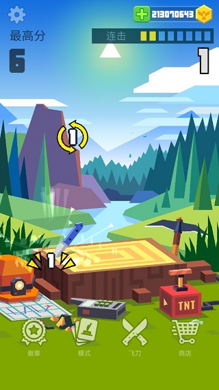 2、在连击模式中的规则十分简单,游戏开始时我们的刀具将以竖插在树桩中的姿态出场,而我们要做的就是选择刀具不同的部位后将其以一定的力度和方向上拉、到达一定程度后放手:此时刀具就会沿着之前玩家给予的轨迹滑动、旋转,而唯一的要求就是刀具落下时刀尖必须朝下,这样才能继续立于砧板之上。